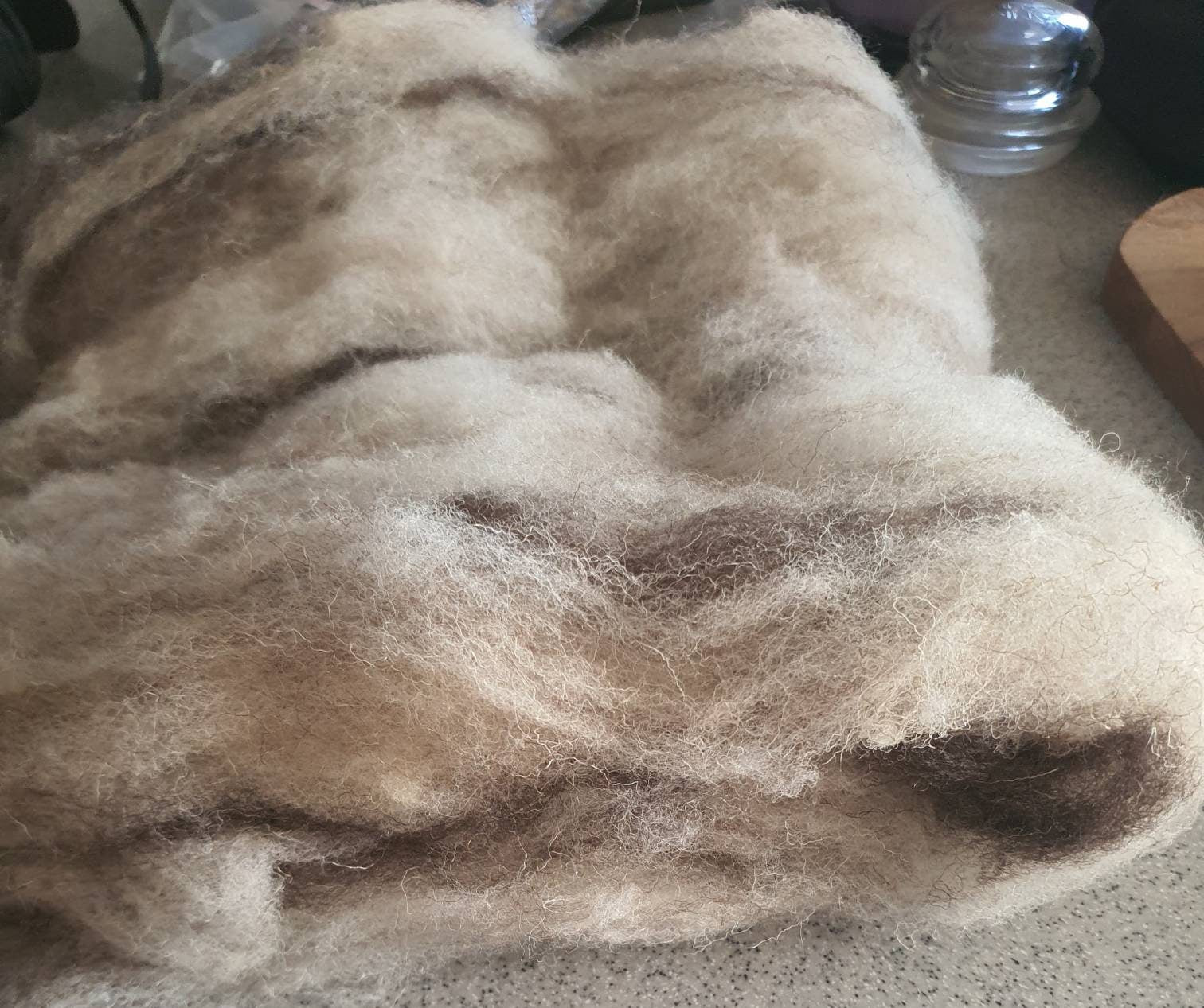 Shetland wool batt in different shades of white, beige and brown, spins up to a beautiful tweed effect yarn.