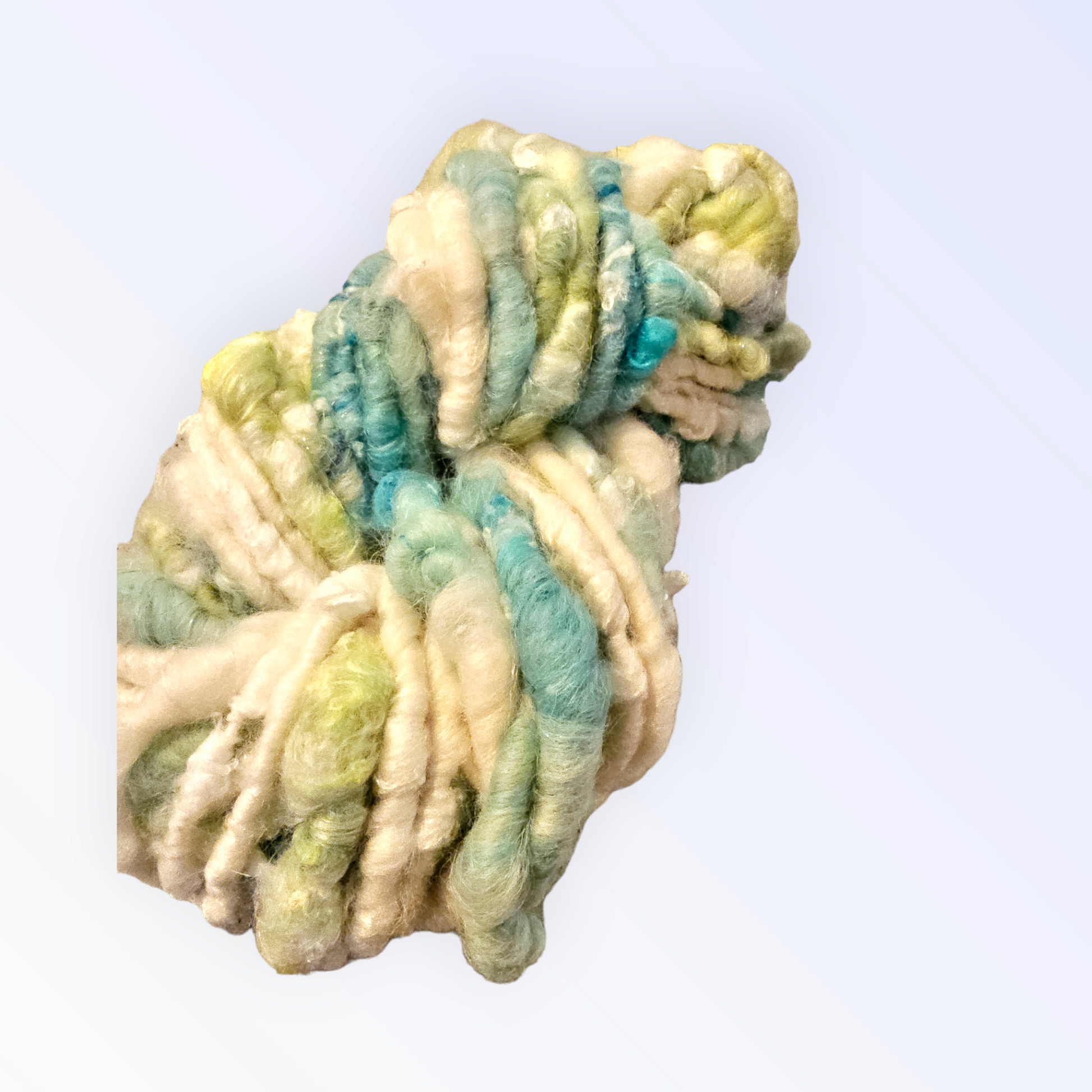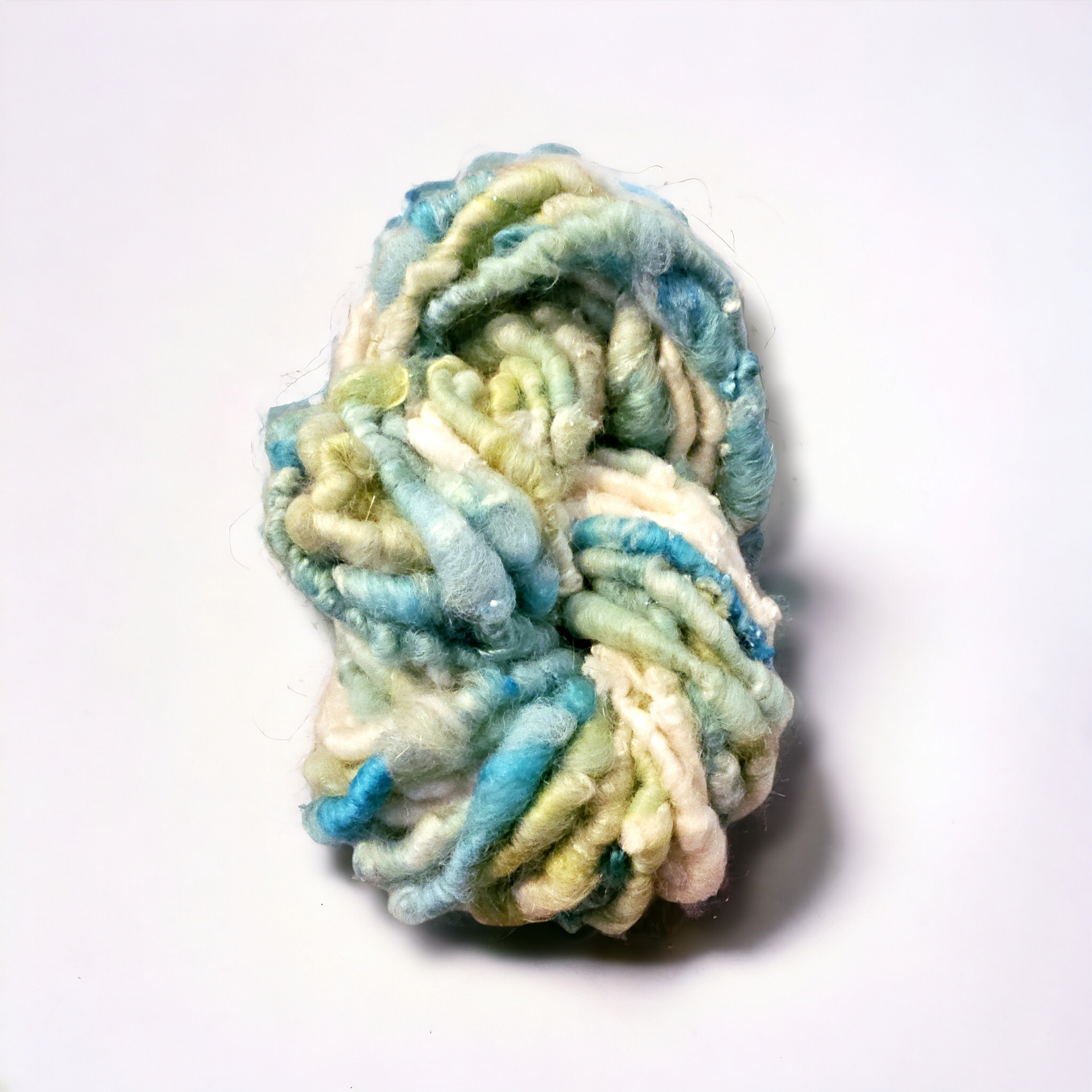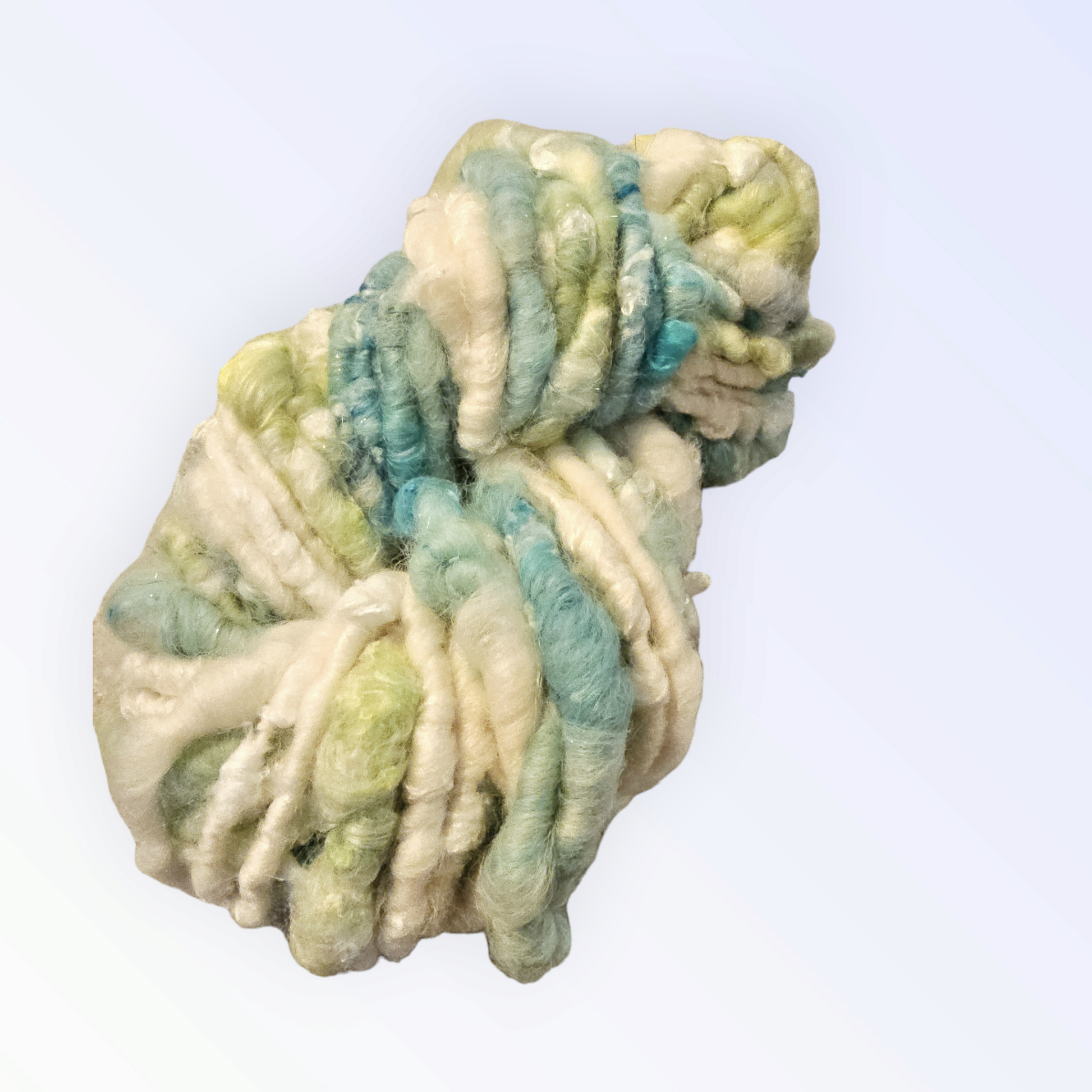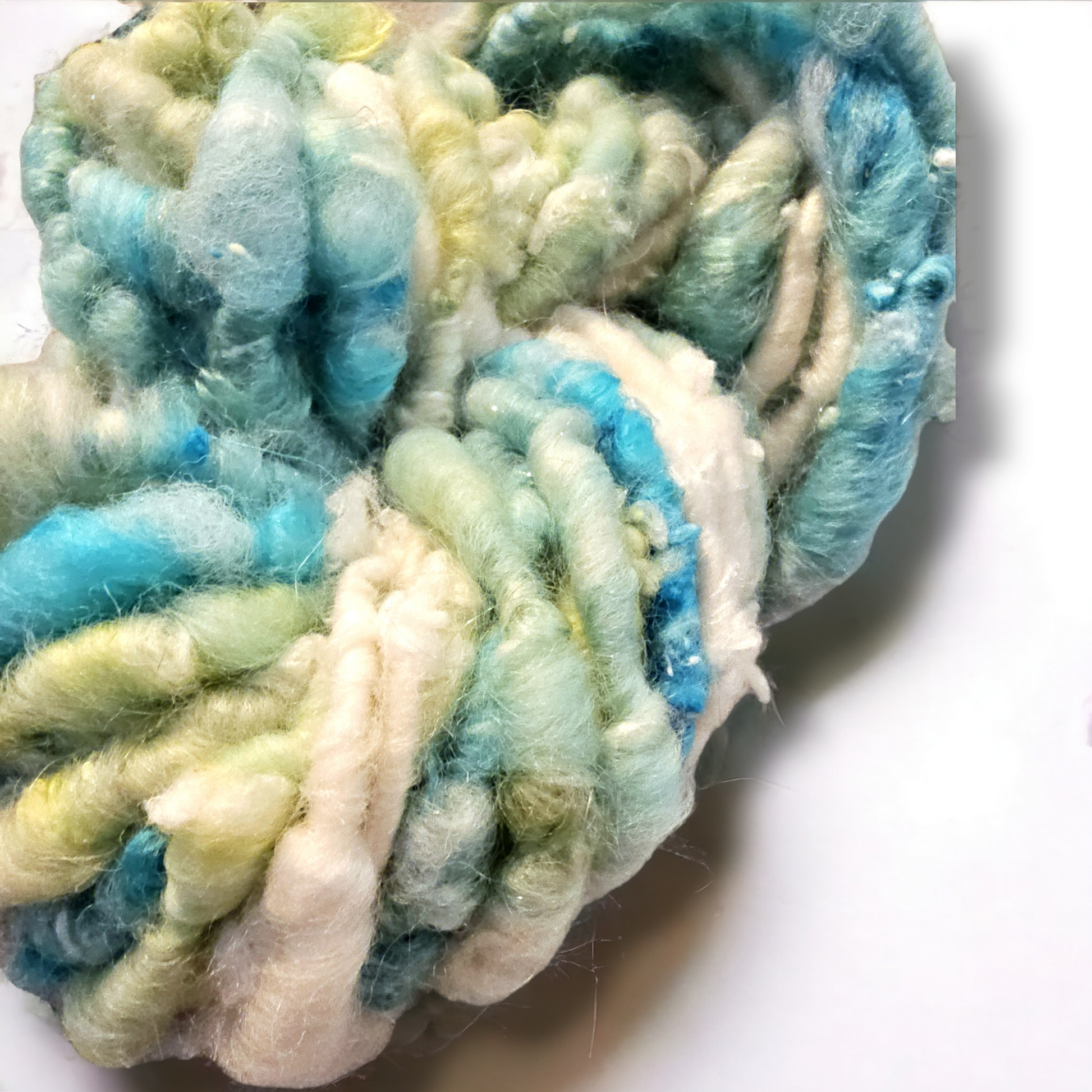 Hand-spun art yarn in Beautiful blues and greens. (Super chunky yarn)