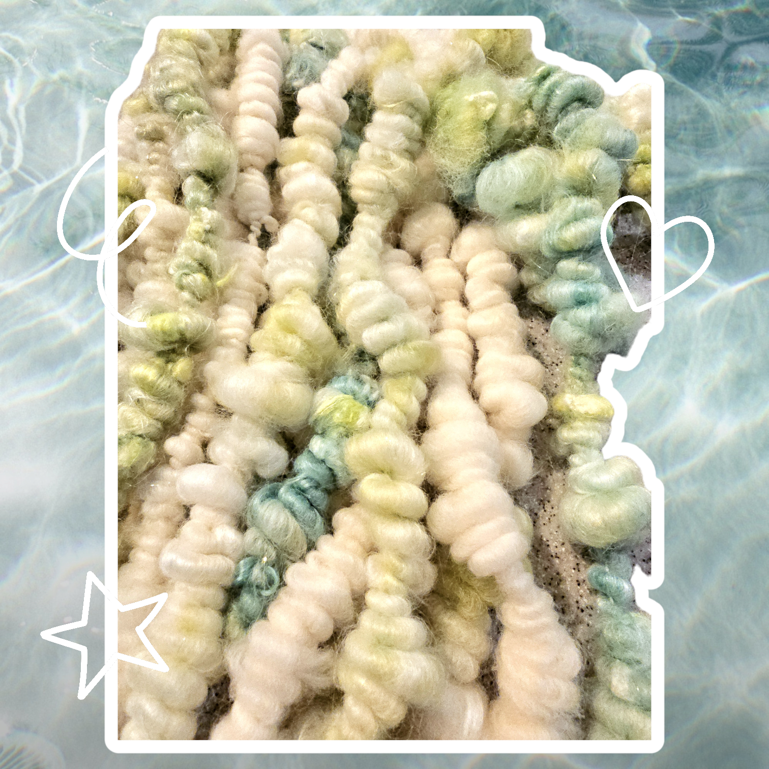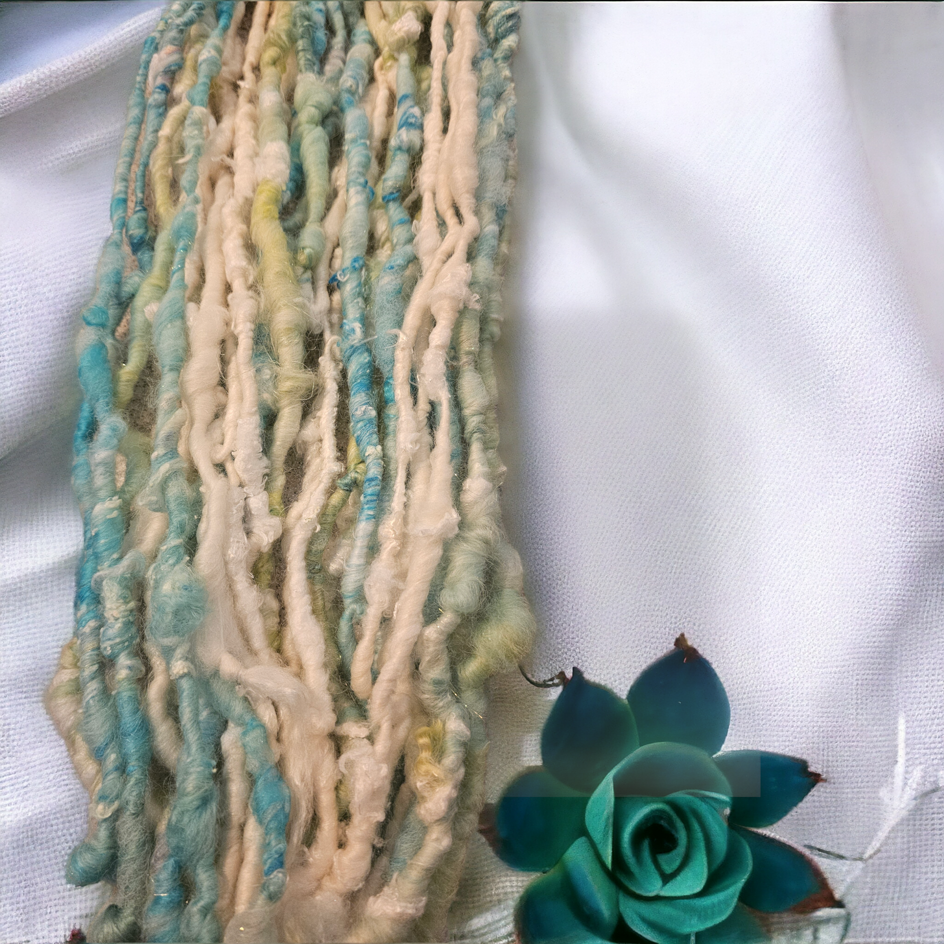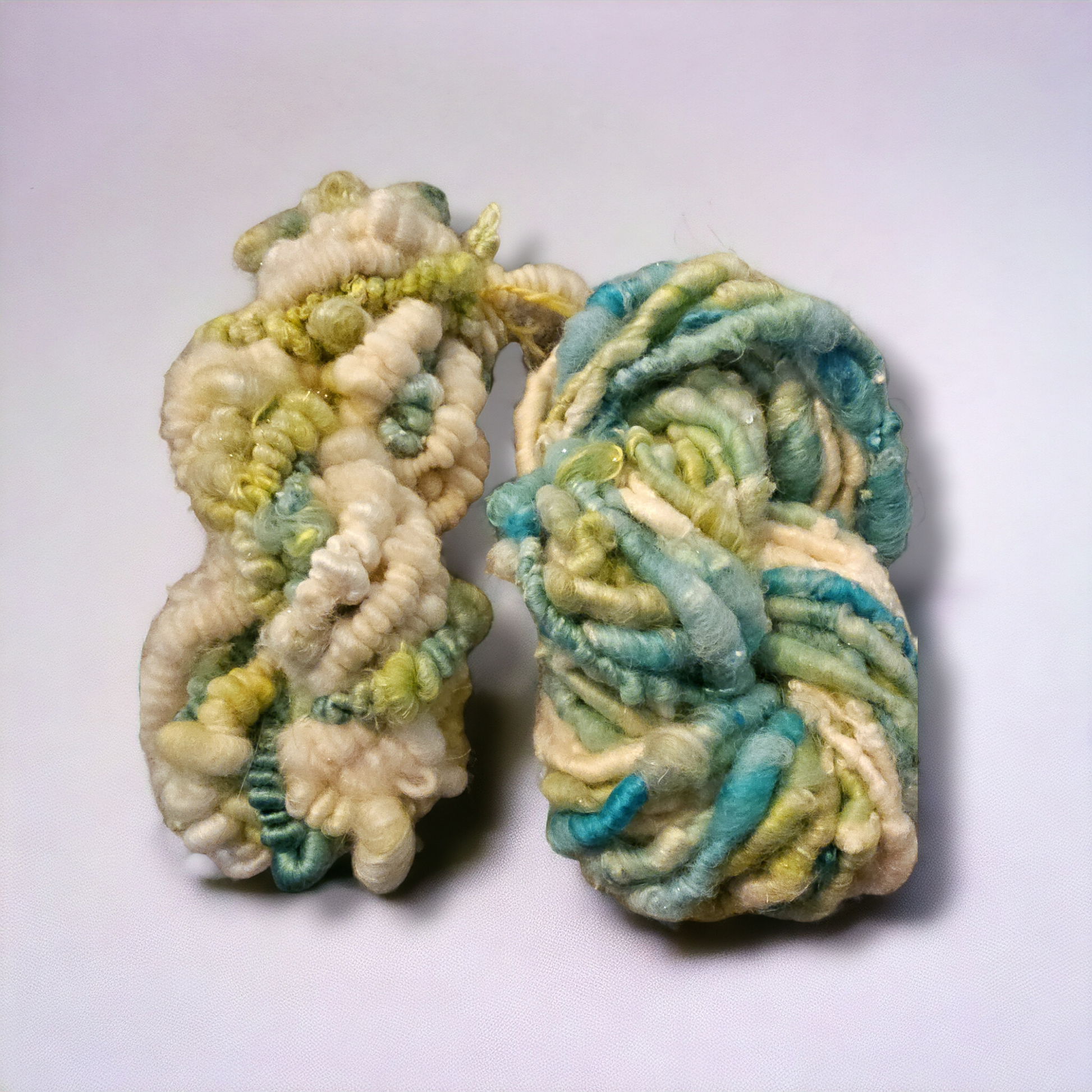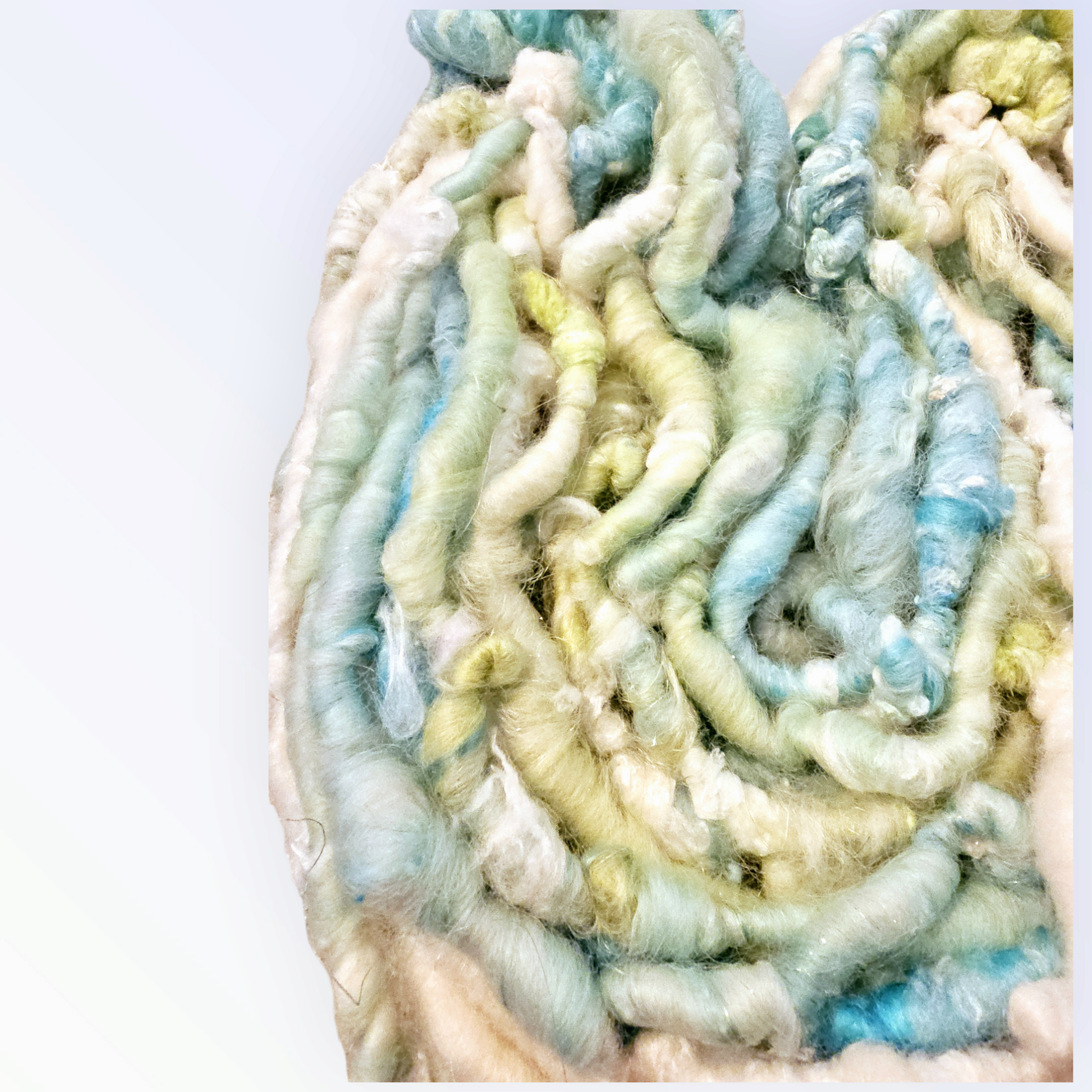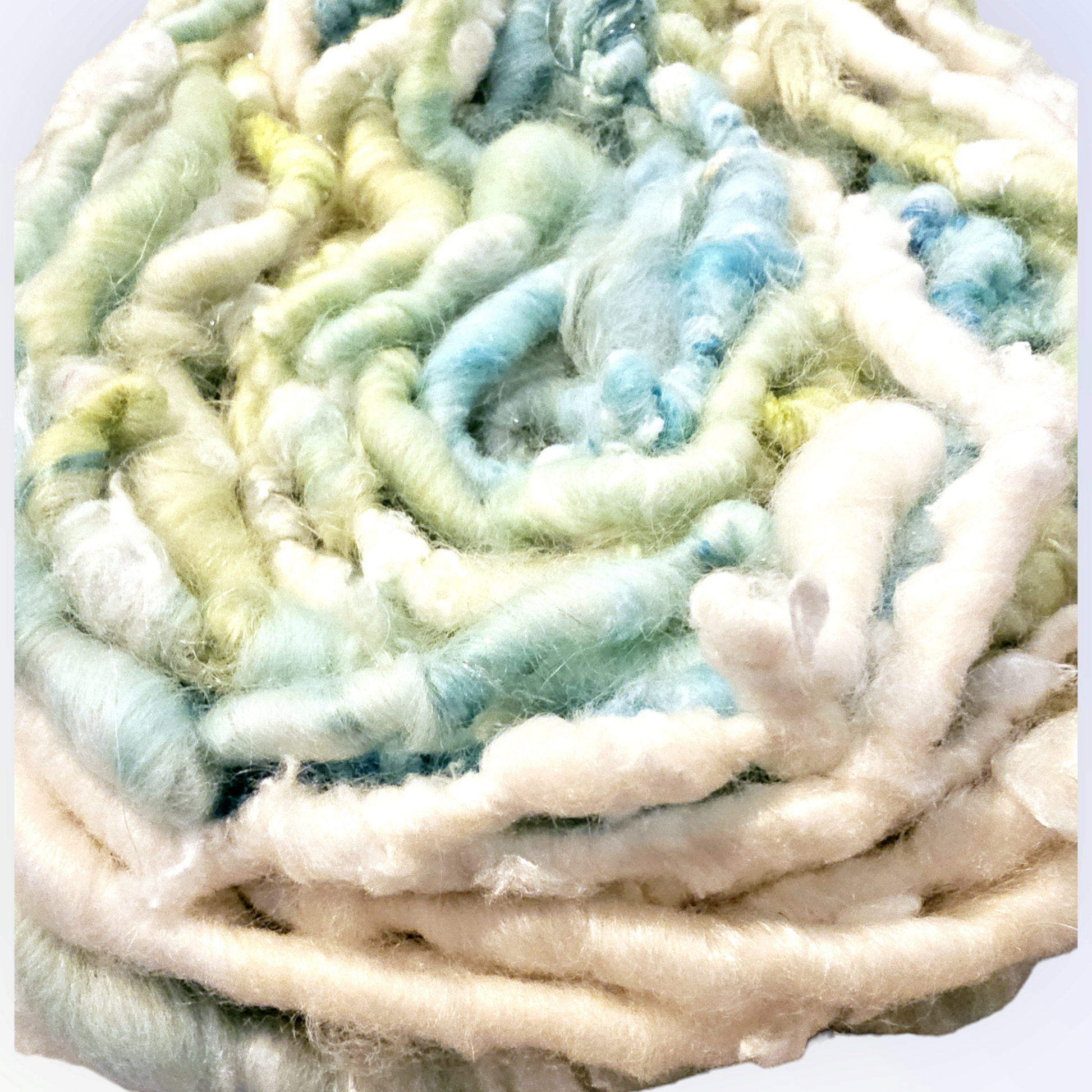 Hand-spun art yarn in Beautiful blues and greens. (Super chunky yarn)