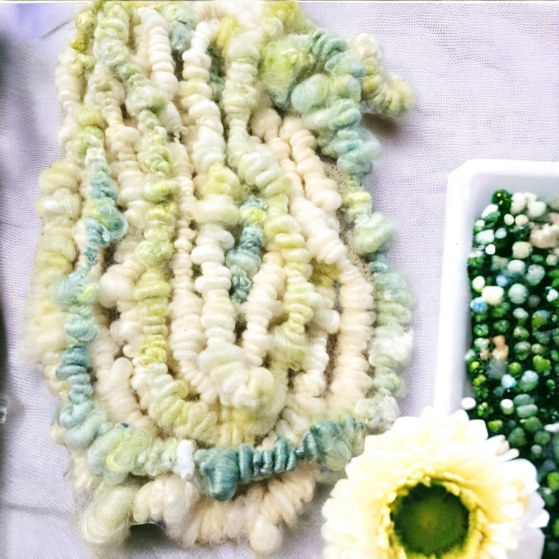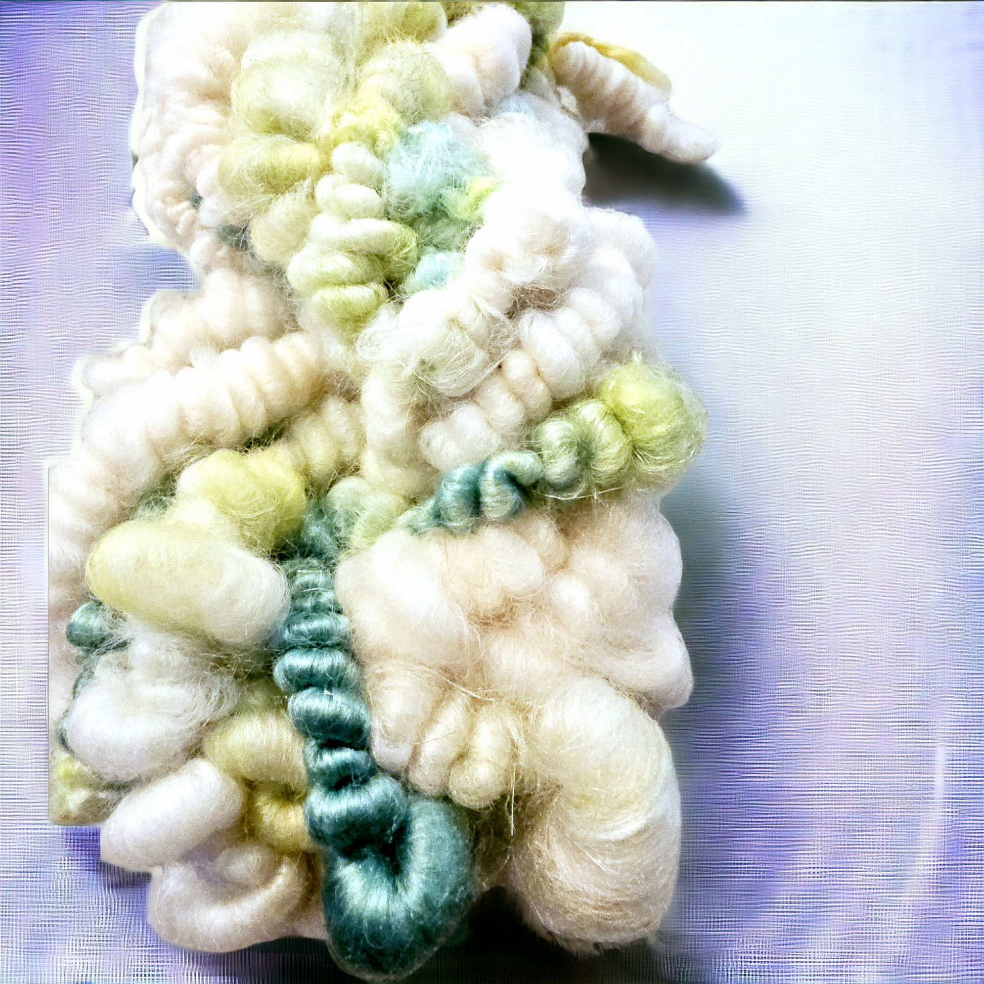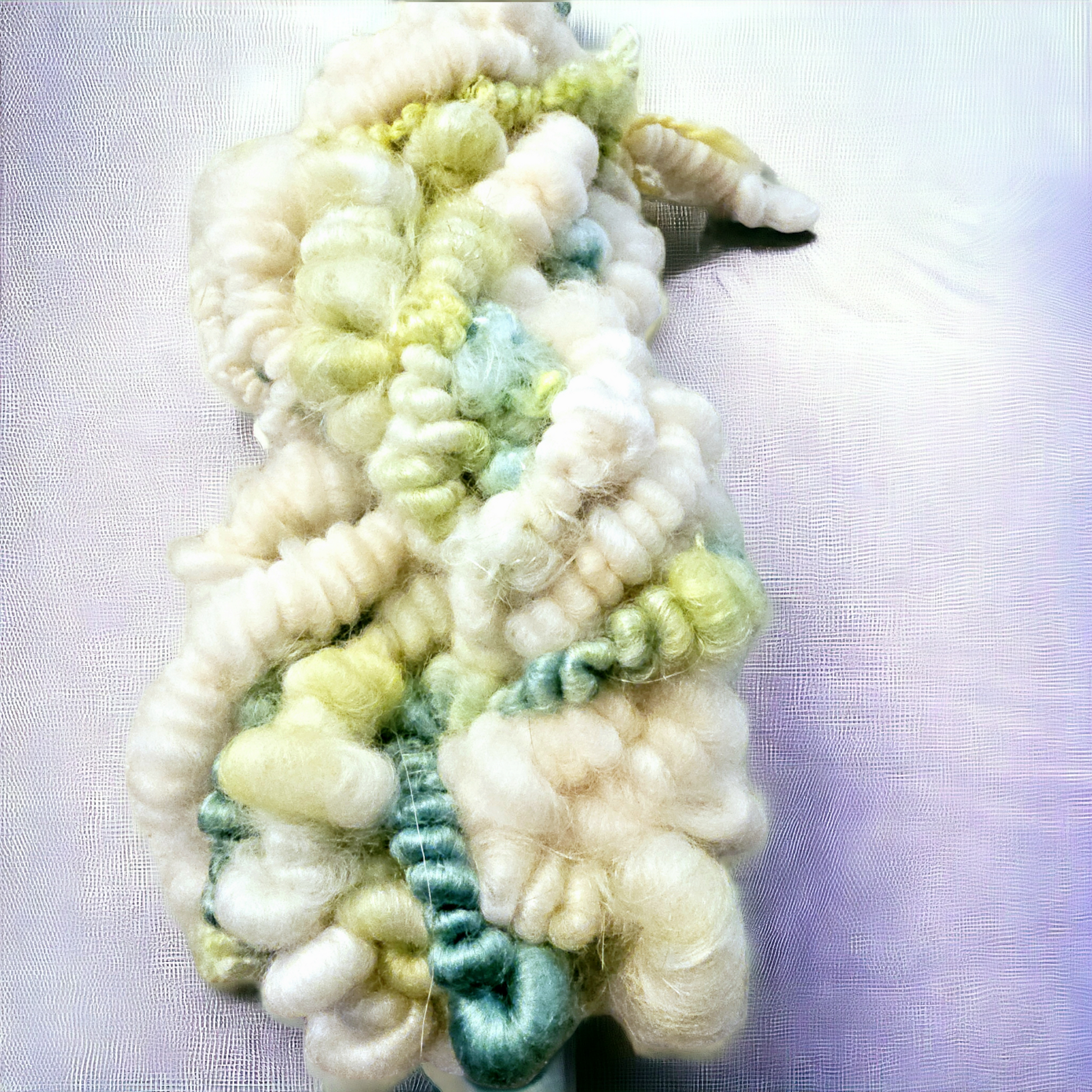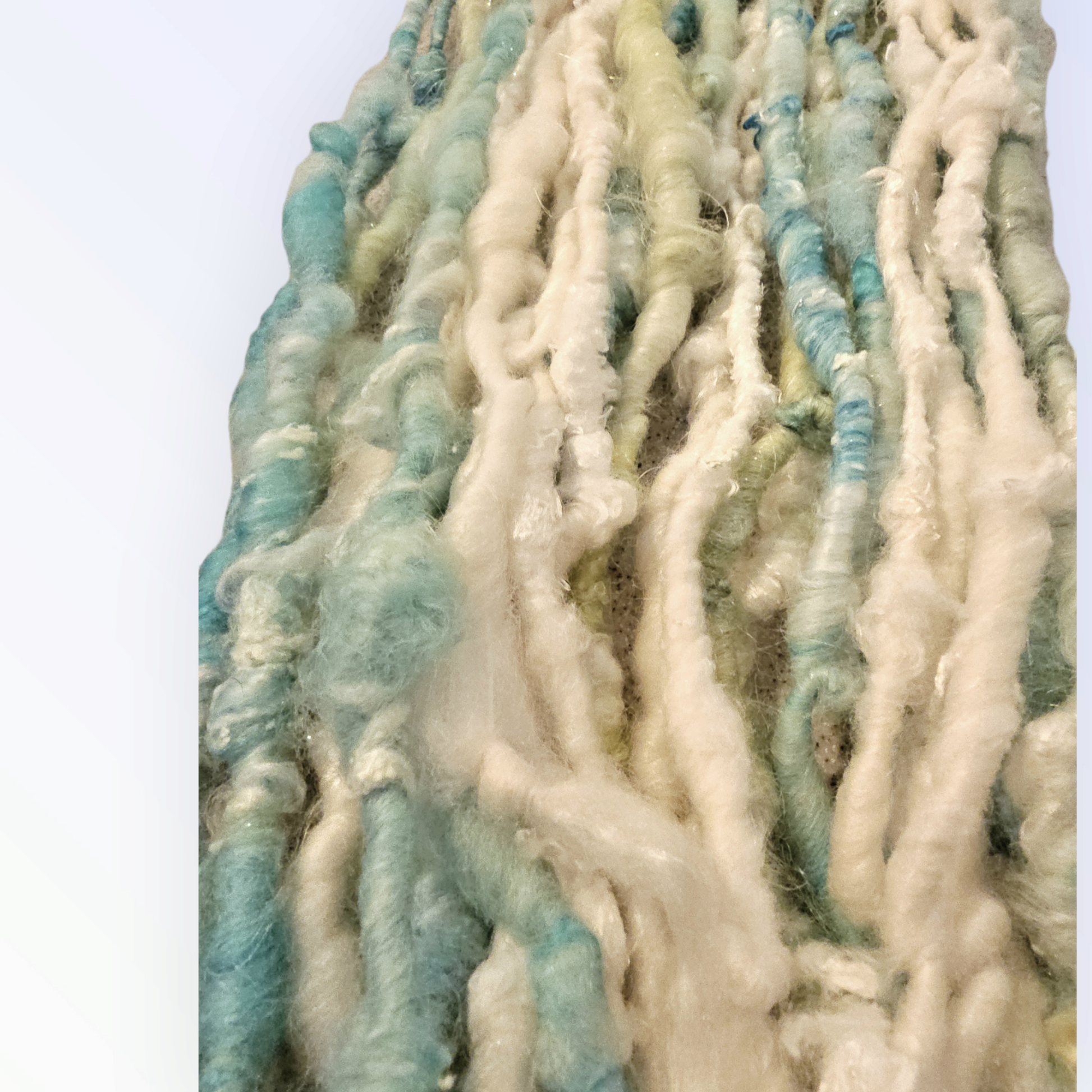 The wool itself contains merino, wool locks, bamboo staple fires and silk with a cotton core. This is a one off unique piece but similar can be made upon request. Super chunky Art Yarn.