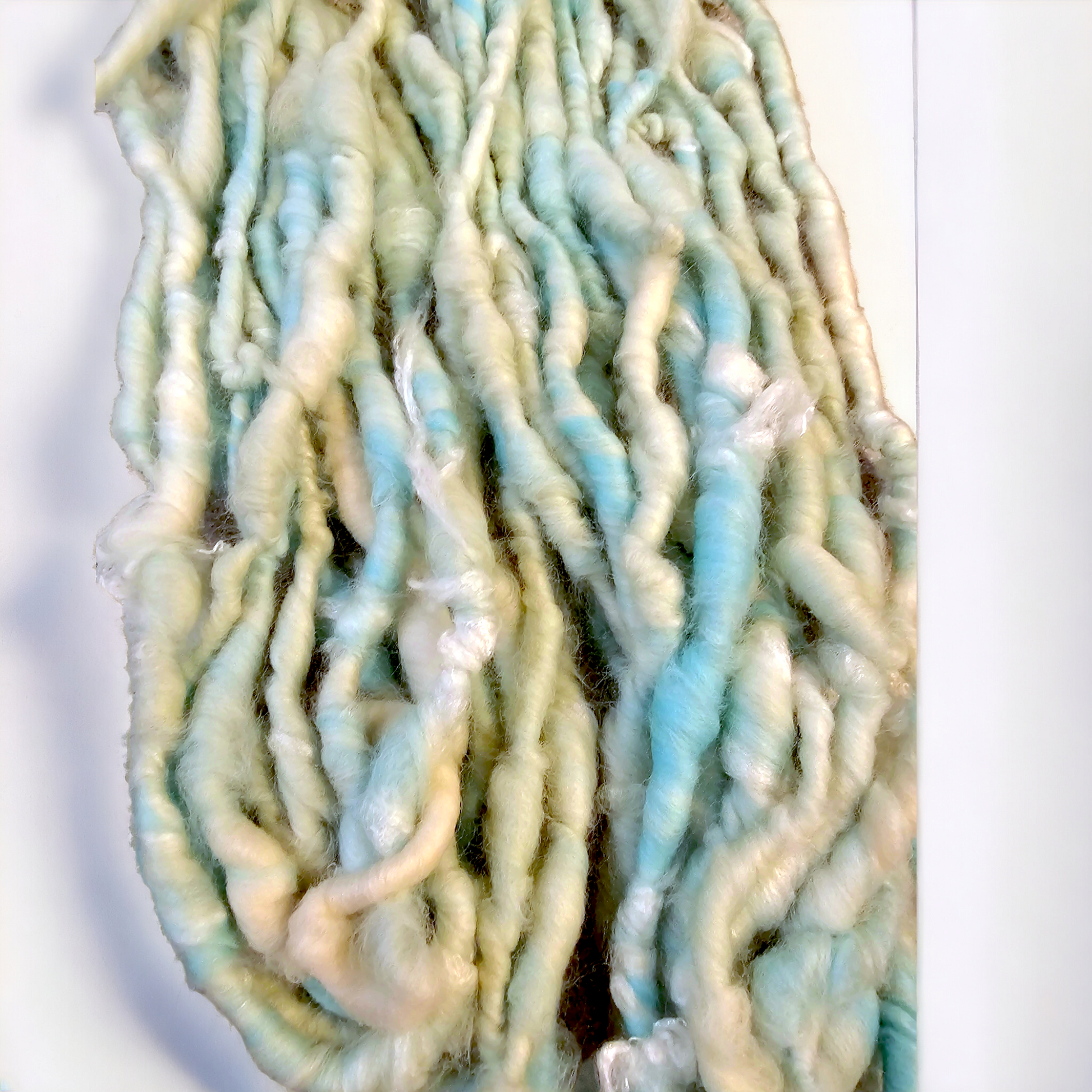 The wool itself contains merino, wool locks, bamboo staple fires and silk with a cotton core. This is a one off unique piece but similar can be made upon request. Super chunky Art Yarn.
