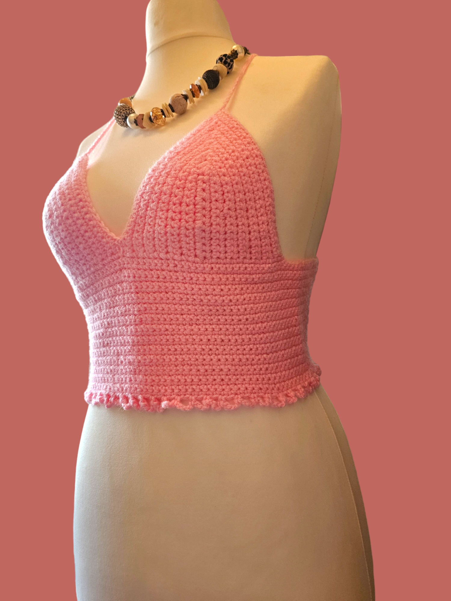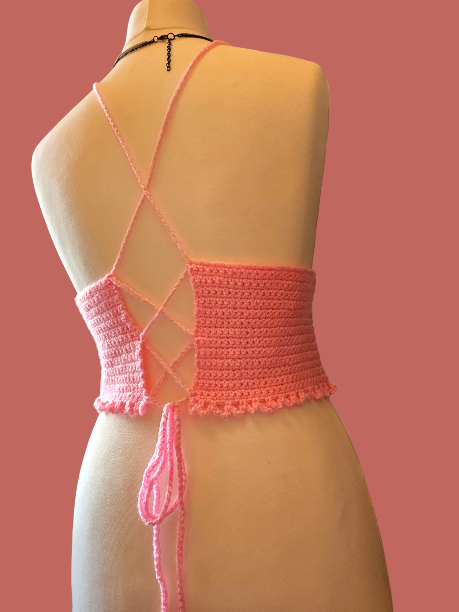 Handmade beautiful pink crochet cropped top UK Size 10-12. Perfect for Summer holidays and festivals. One of a kind .