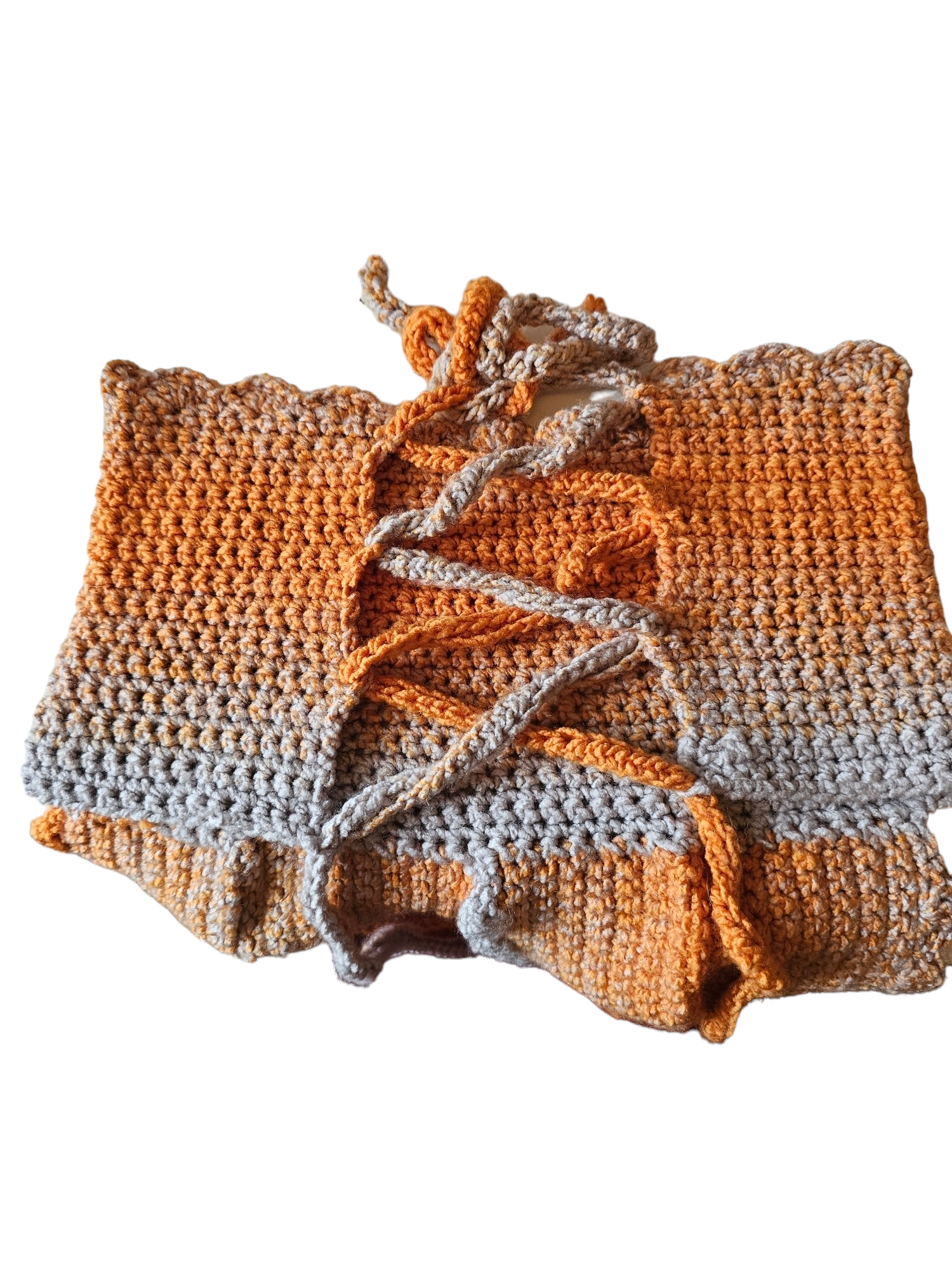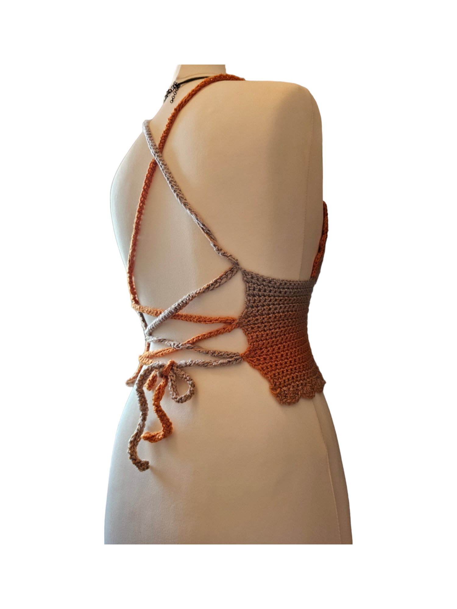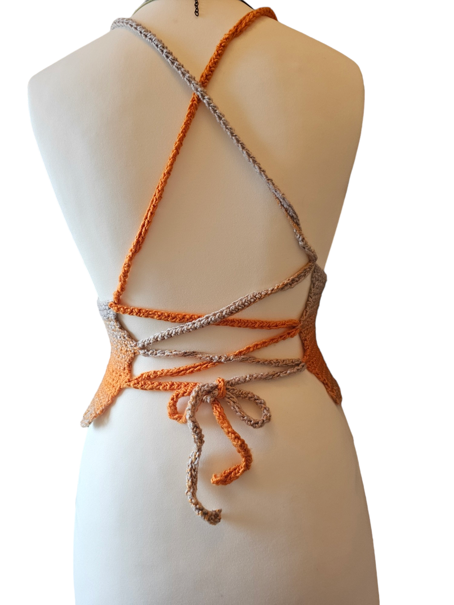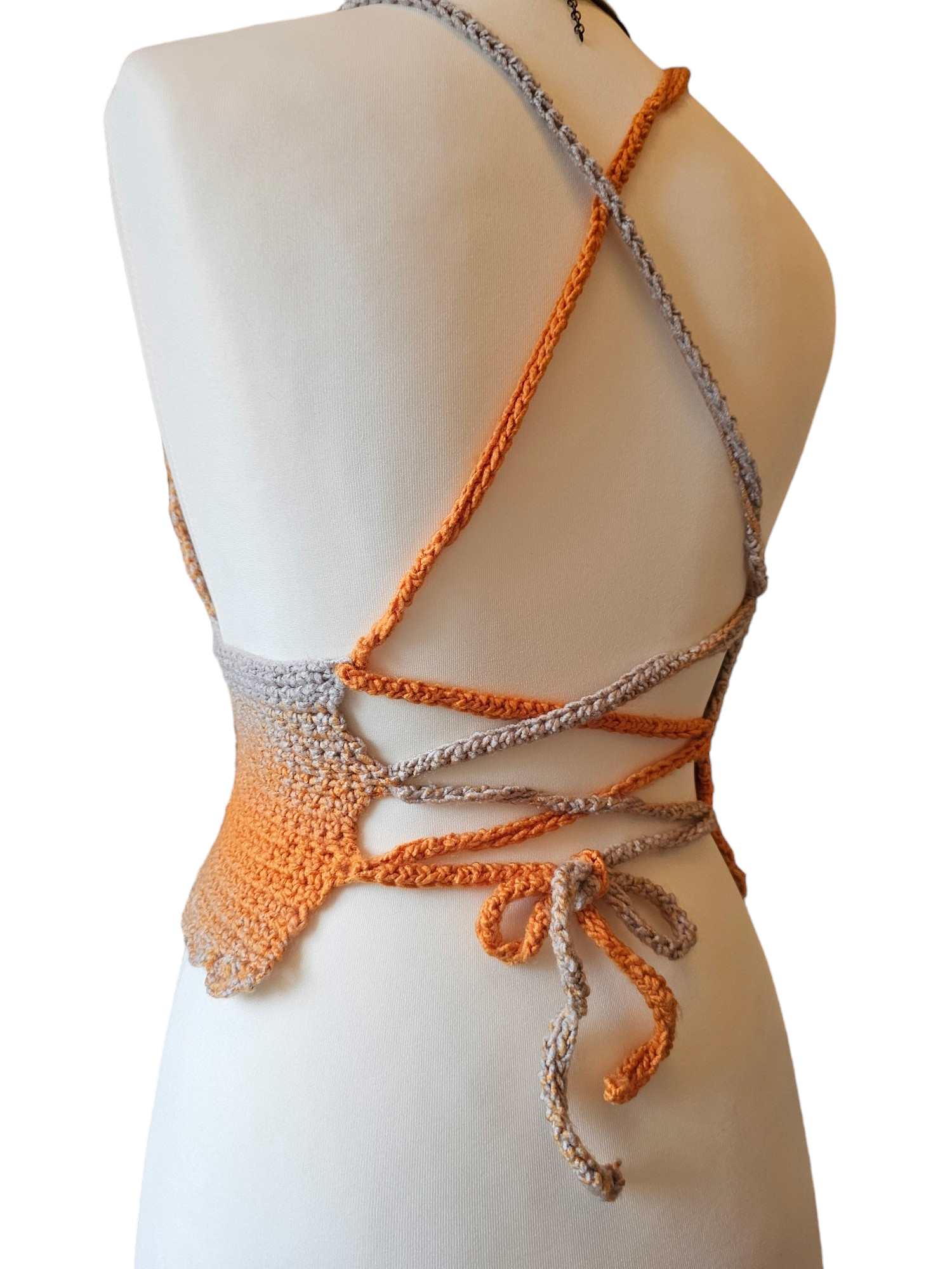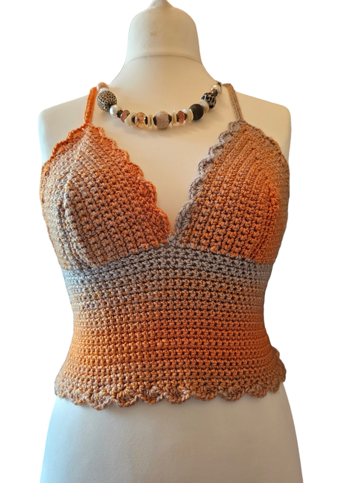 Handmade crochet scalloped edge cropped top in a beautiful orange and silver colour. Perfect for summer festivals.