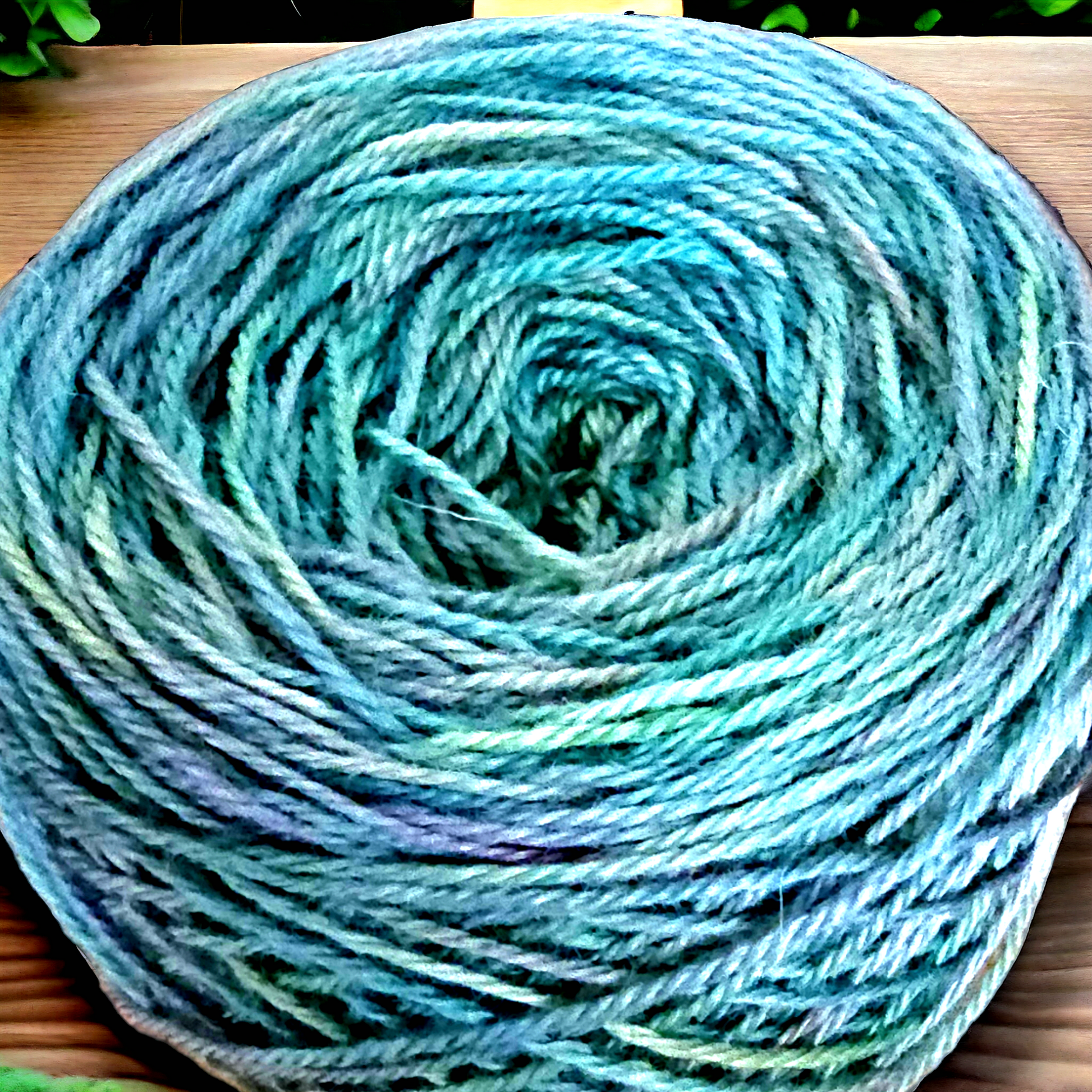 Commercially spun DK weight yarn . This yarn is 100% sheep's wool and has been Hand dyed in beautiful shades of green with added lavender purple.