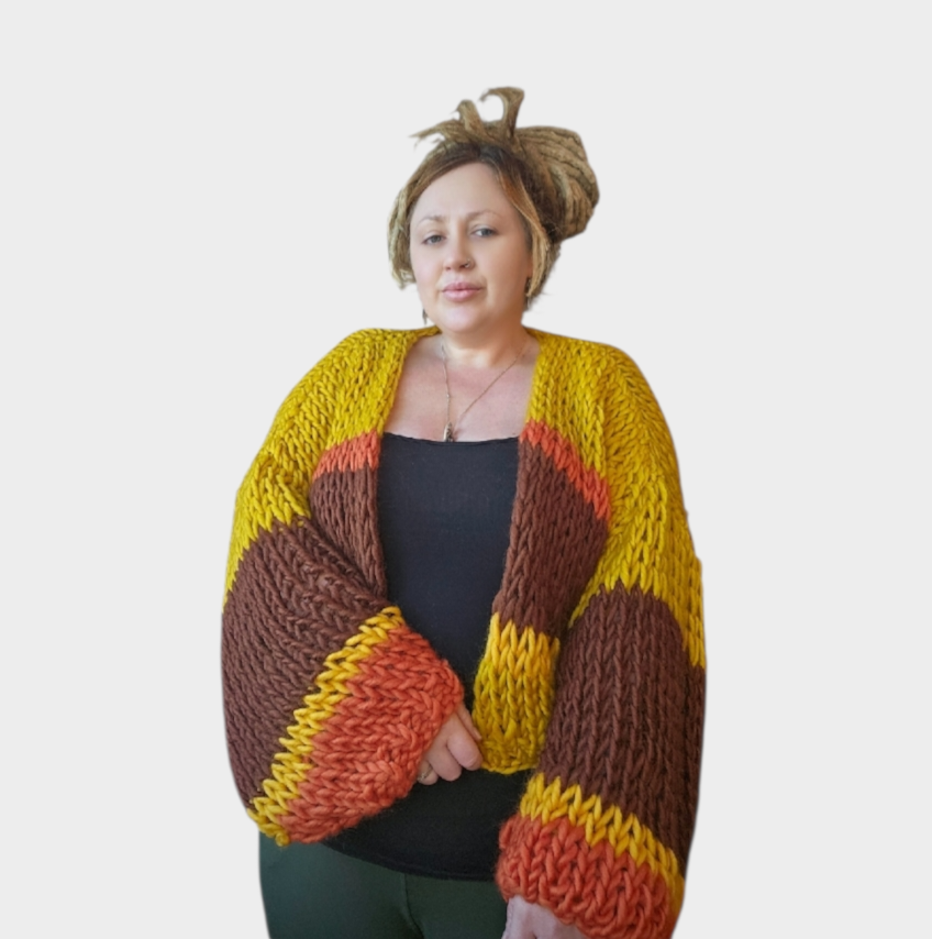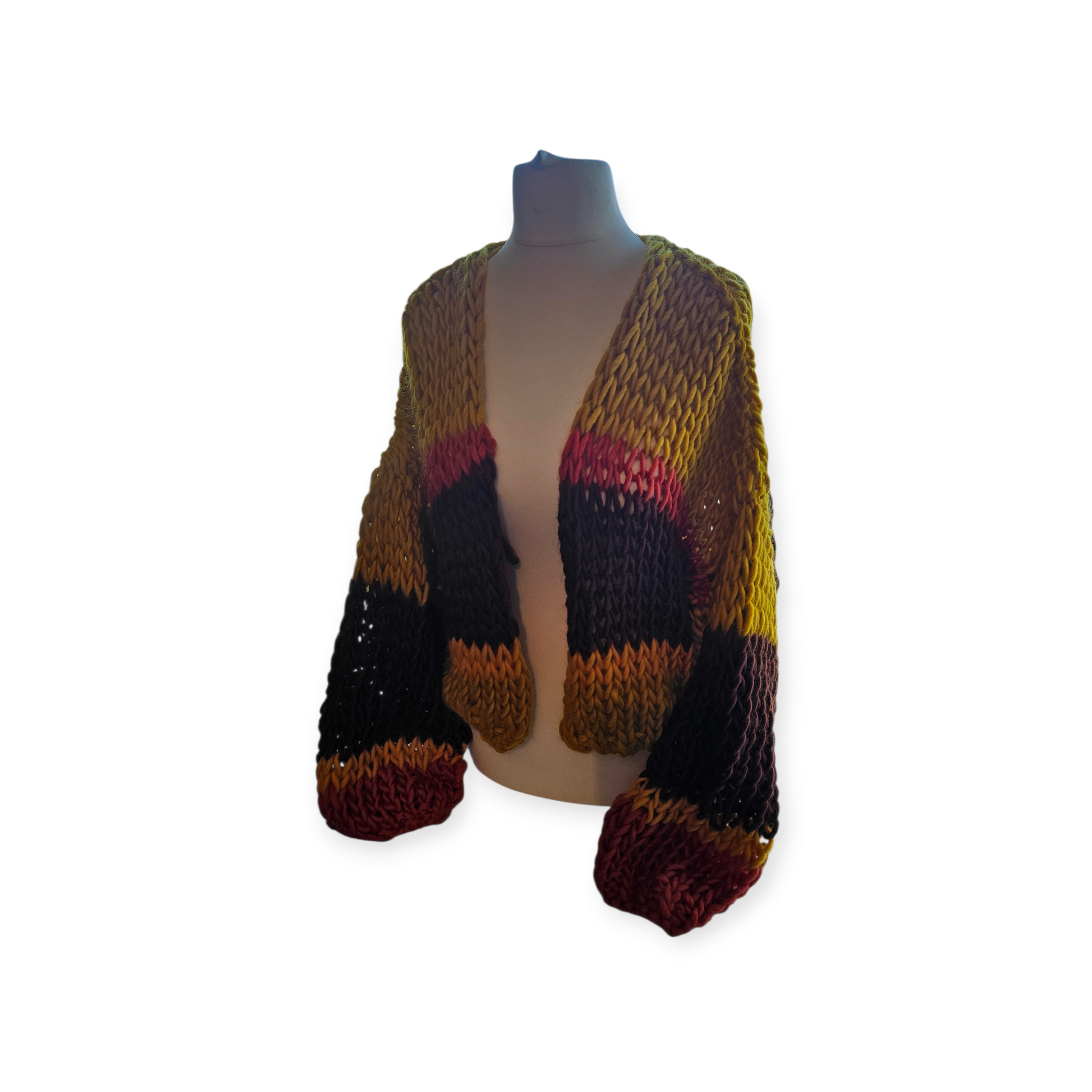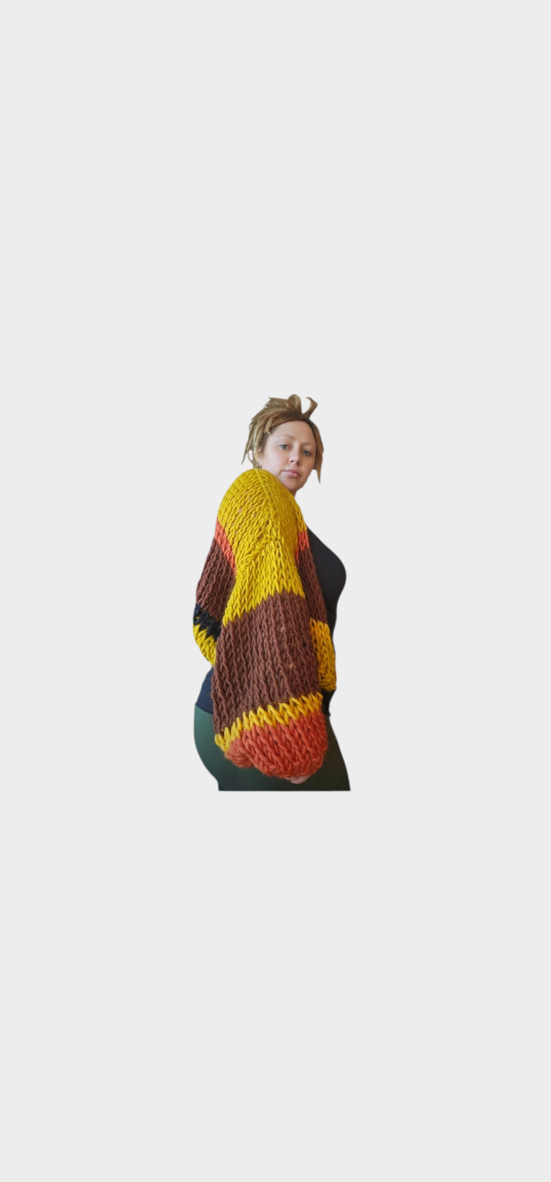 This cardigan is worked flat in simple pieces and seamed together. It uses super chunky yarn and to create a warm, relaxed garment that comes together quickly — even if you don’t remember exactly what day you started.