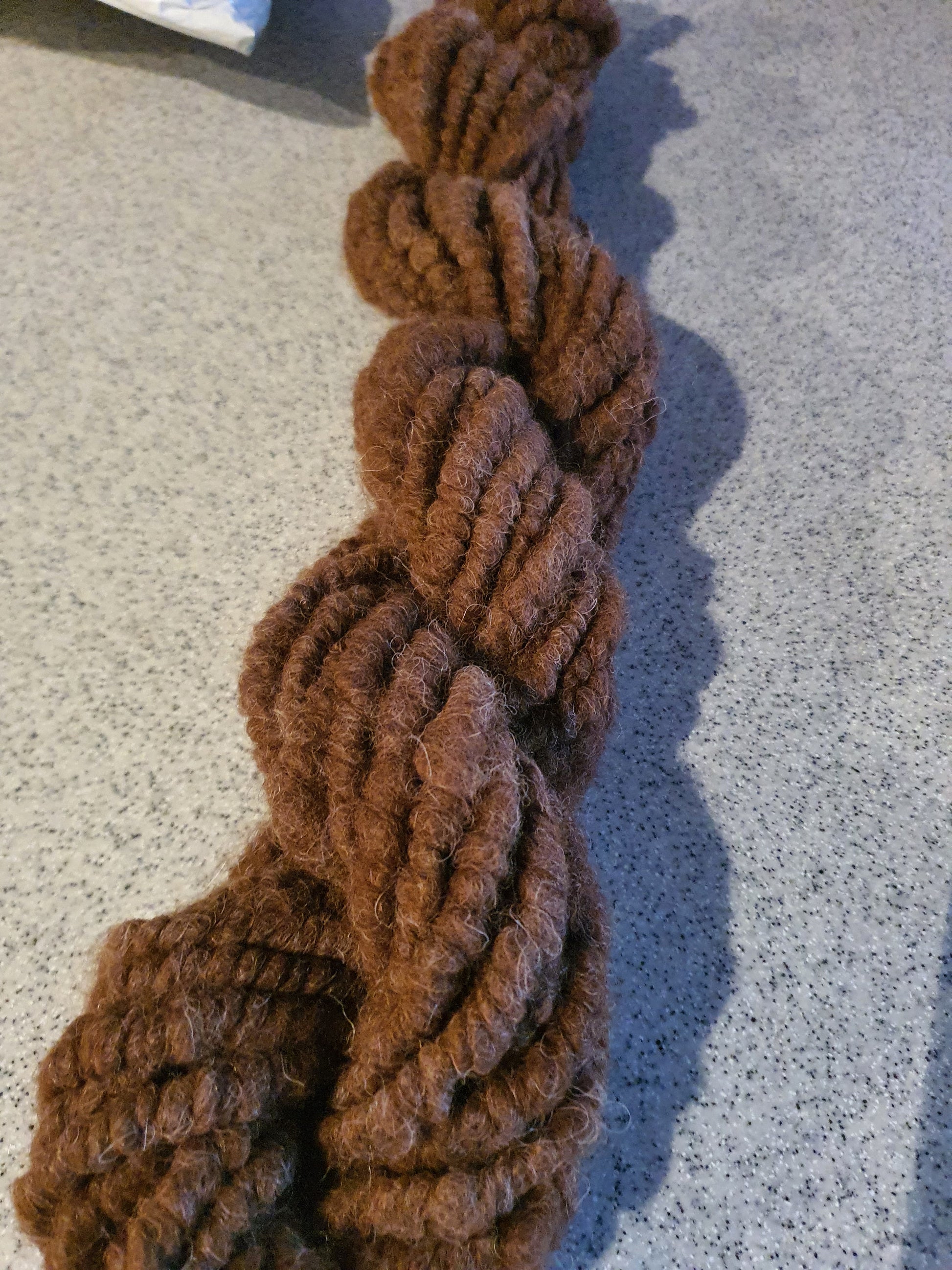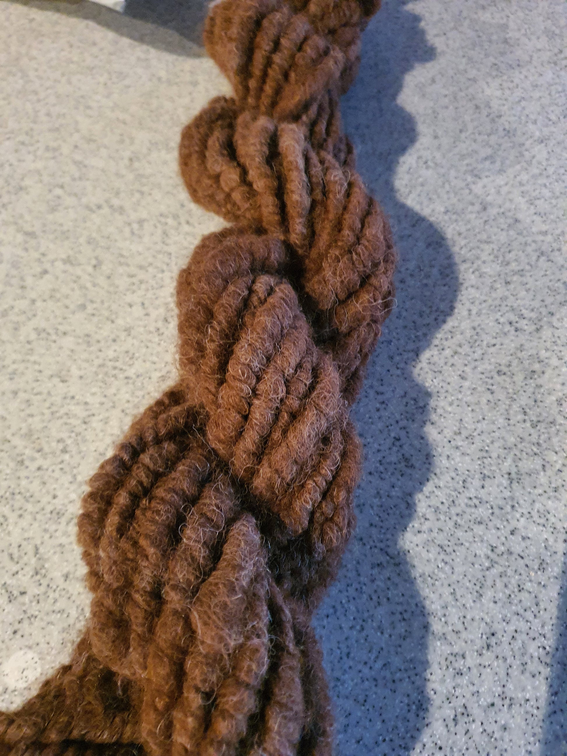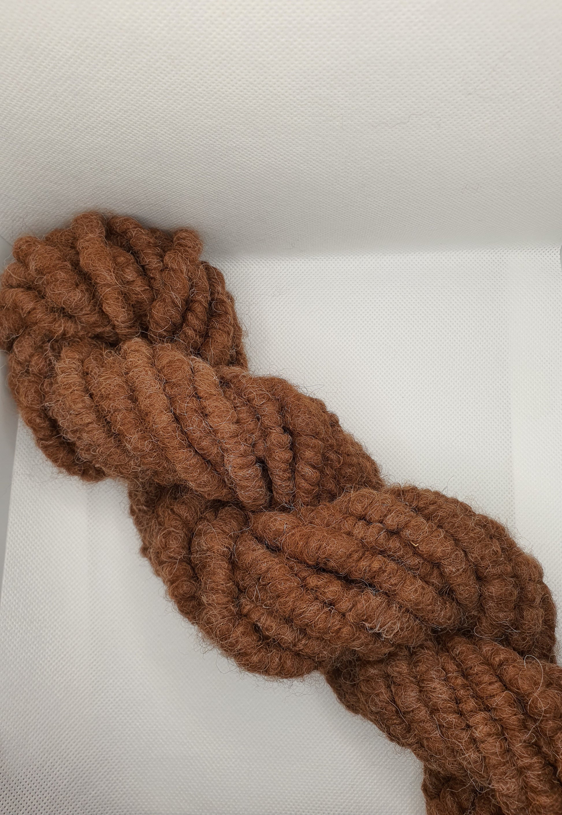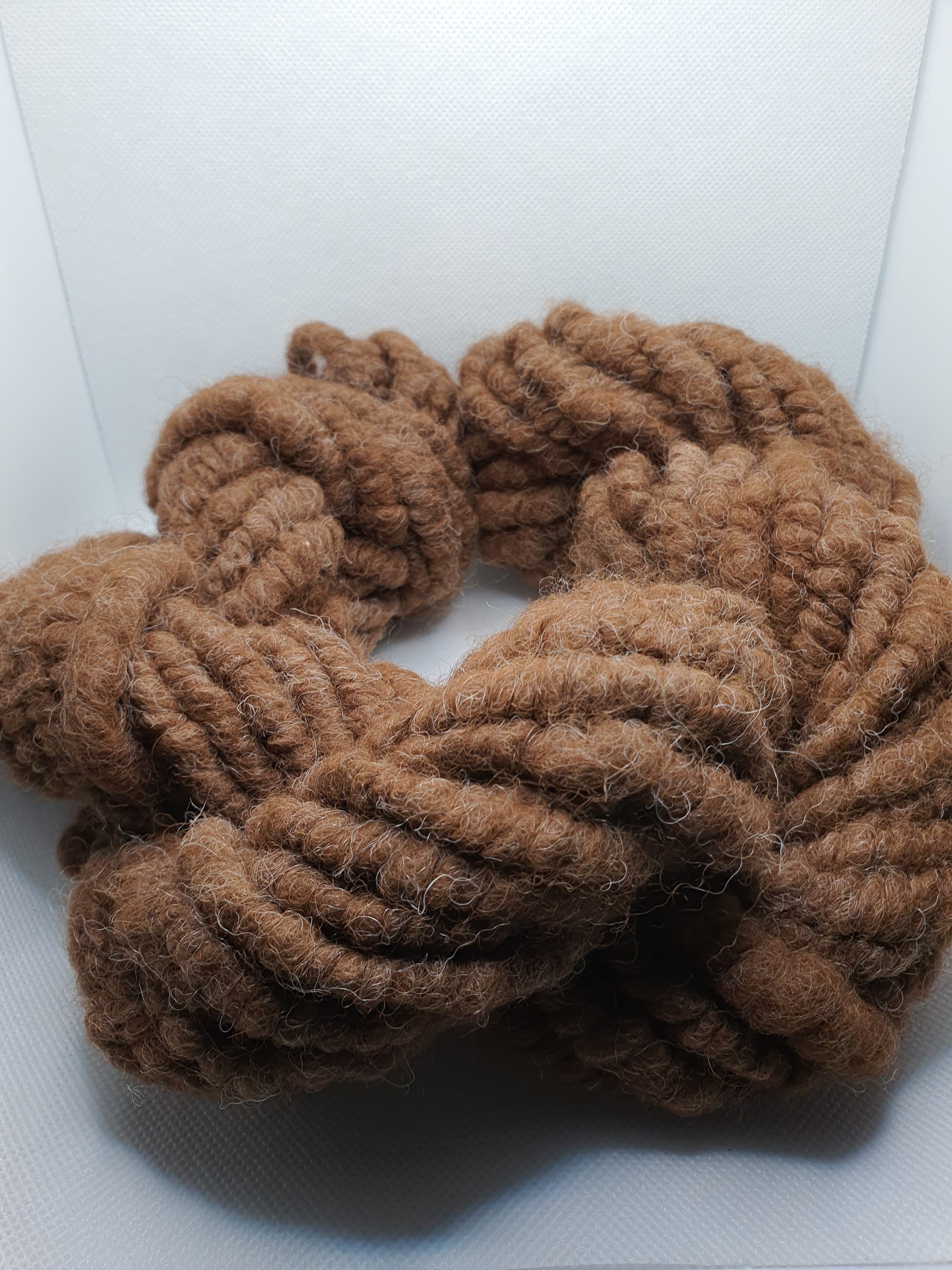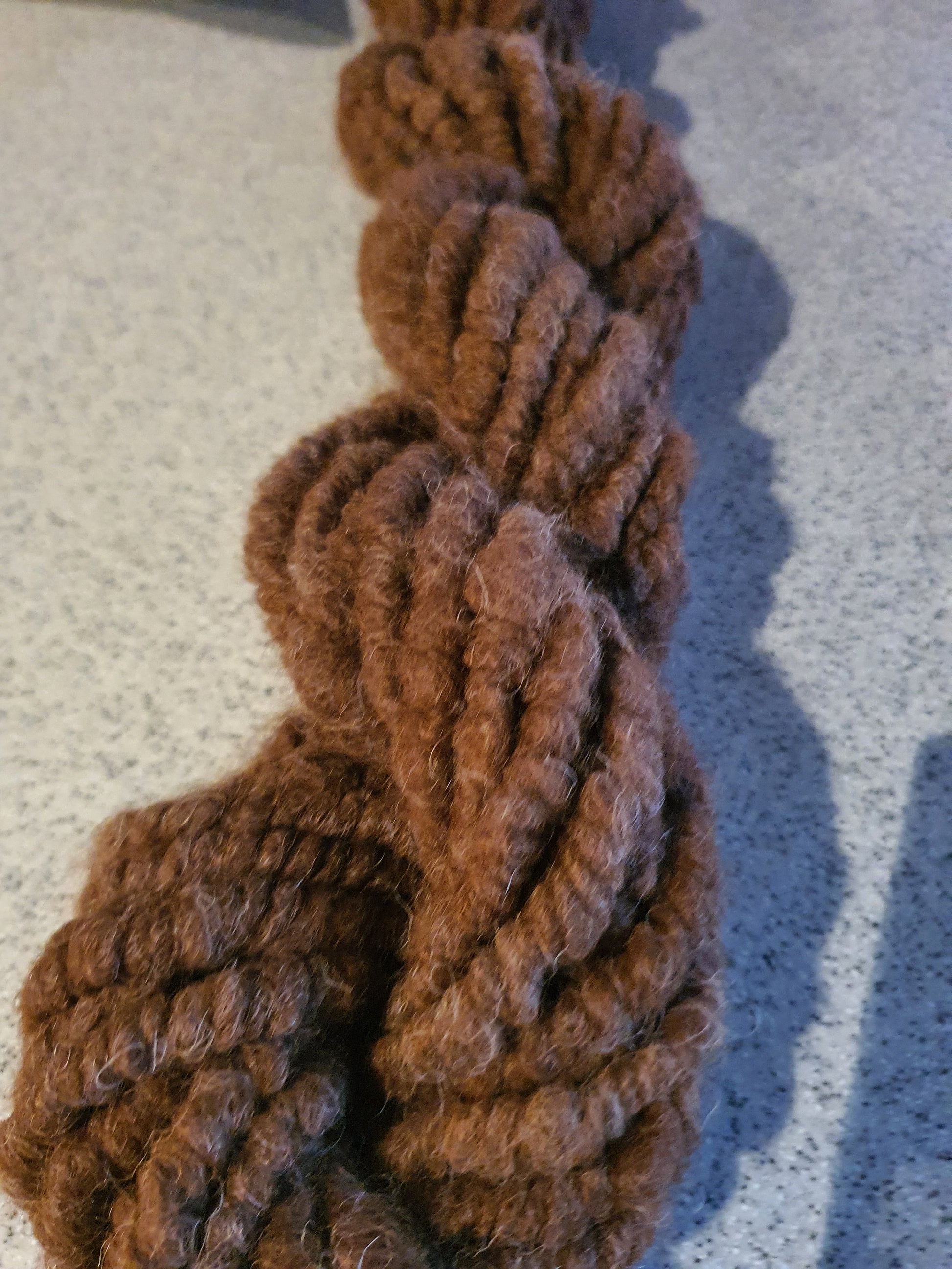 The alpaca is from a local farm and has been hand spun with care. It's is a chunky/super chunky yarn which has been core spun- meaning it will be strong no matter what craft you use it for. A beautiful chocolate brown colour.